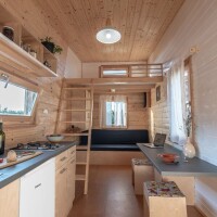 Sve je u njoj malo: mala kuhinja sa stolom za ručavanje, mali dnevni boravak s trosjedom, iznad je galerija sa spavaćim dijelom, a na suprotnojoj strani smješten je sanitarni čvor s tuš-kabinom i tzv. kompozitnim suhim WC-om.