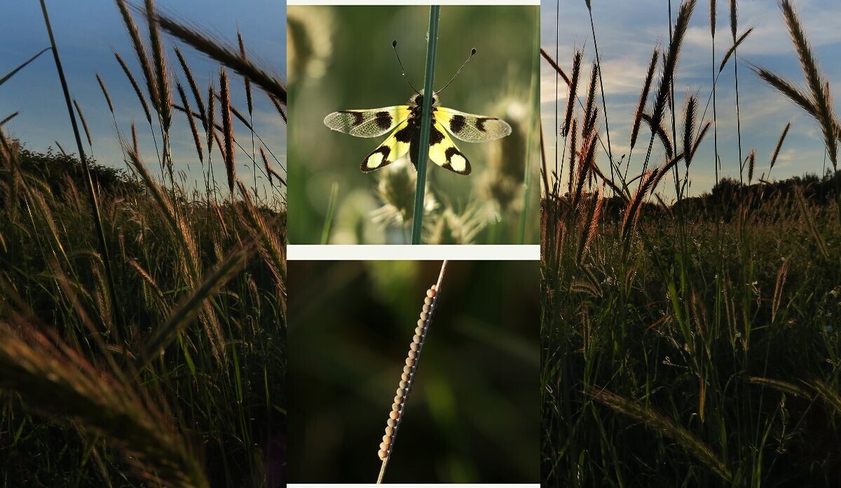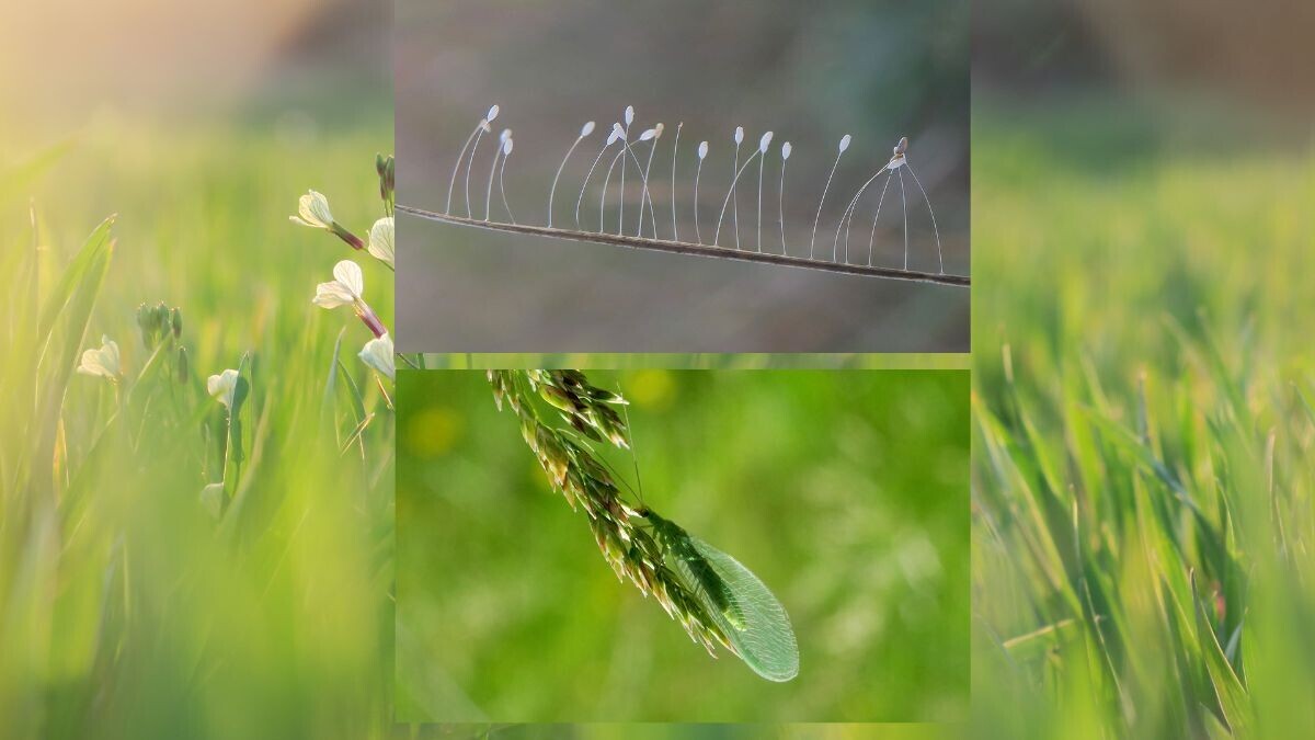 Druga ženka, Žuti leptirak (Libelloides macaronius) također iz reda Mrežokrilaca polaže jaja u redove na stabljici poput nanizanih biserja.