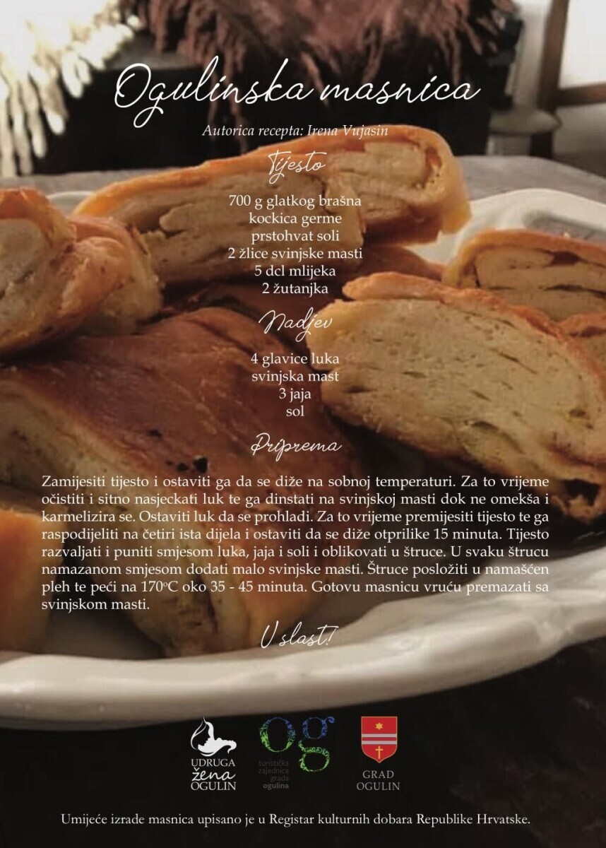Ogulinska masnica se radi od mekanog dizanog tijesta punjenog pirjanim lukom i jajima, a cijela je tajna u domaćoj svinjskoj masti koja joj daje prepoznatljiv, pun okus.