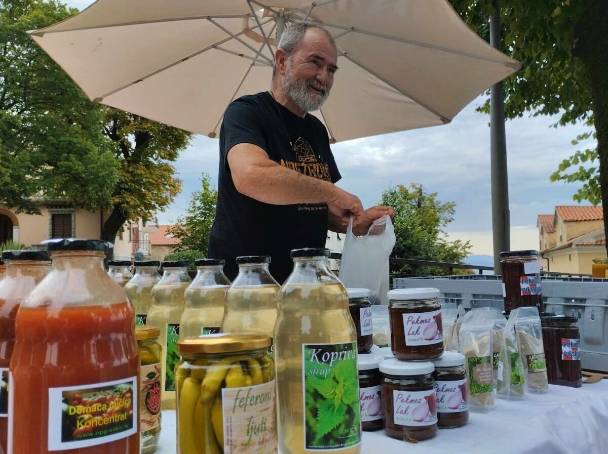 Na njegovom štandu su se, između ostaloga, našle tikvice u octu. Ovog povrća sada ima u izobilju, toliko da se bacaju, a mogu se fino ukiseliti. "Samo se treba sjetiti. Nisu blanširane, sirove su, a tajna je u tome da sve bude hladno - staklenka, ocat, tikvice - da ne bi otišle u kašu”, napominje Sokić.