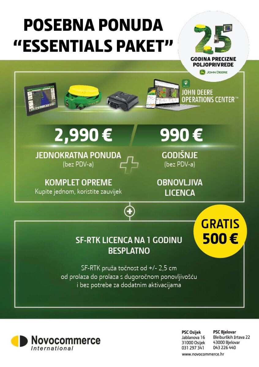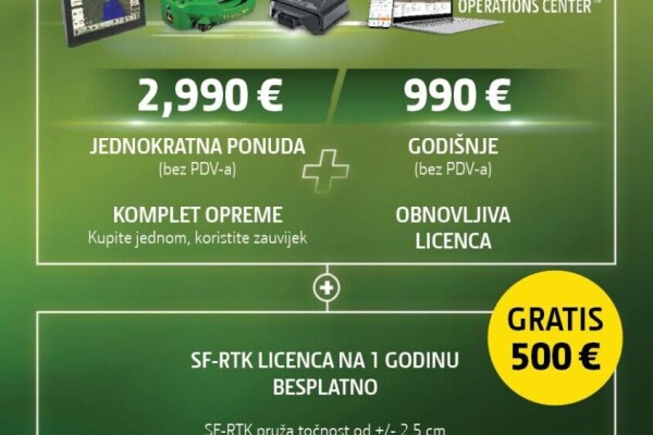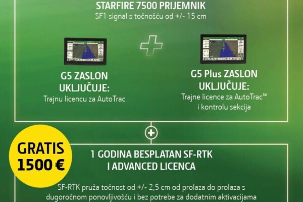 Posebna ponuda opreme za preciznu poljoprivredu! 📣 1️⃣ Precision Ag Essentials (SF7500, G5+ i JDLink M modem uz obnovljive licence) 2️⃣ Originalni paket (SF7500 i G5/G5+ uz trajne licence) 🆓 SF-Rtk i Advanced licenca 📅 Akcija vrijedi do... Više [+]