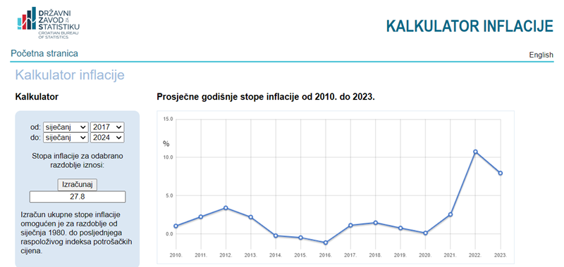 Za podatke vezano uz inflaciju, koristit ću primarno period 2014-2024. Prema podacima Državnog zavoda za statistiku, inflacija je iznosila ukupno 27,8%, od čega je većina generirana u razdoblju 2021.-2023.