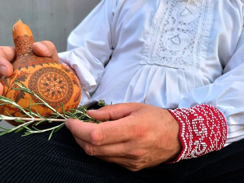 Šarana tikvica, a unutra rakijca. Simbol sela Gradišta. Još je tu i ružmarin, jer ipak jesen je. Valja poraditi poslove, pobrat kukuruze, a onda konačno pripremati svatove.