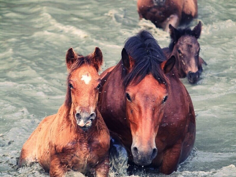 Fotografija prikazuje konje koji prelaze rijeku Lonju. Konji su se nalazili na slobodnoj ispaši u šumi Žutici na pašnjaku Gospođica #RuralFoto, #životinje.