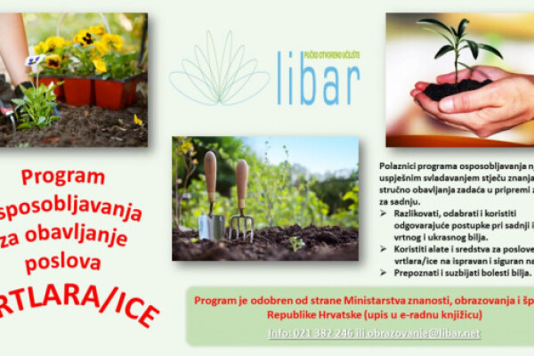 POU Libar u svim svojim poslovnicama Vrši upis u program osposobljavanja za obavljanje poslova VRTLARA/ICE. Program je odobren od Ministarstva...