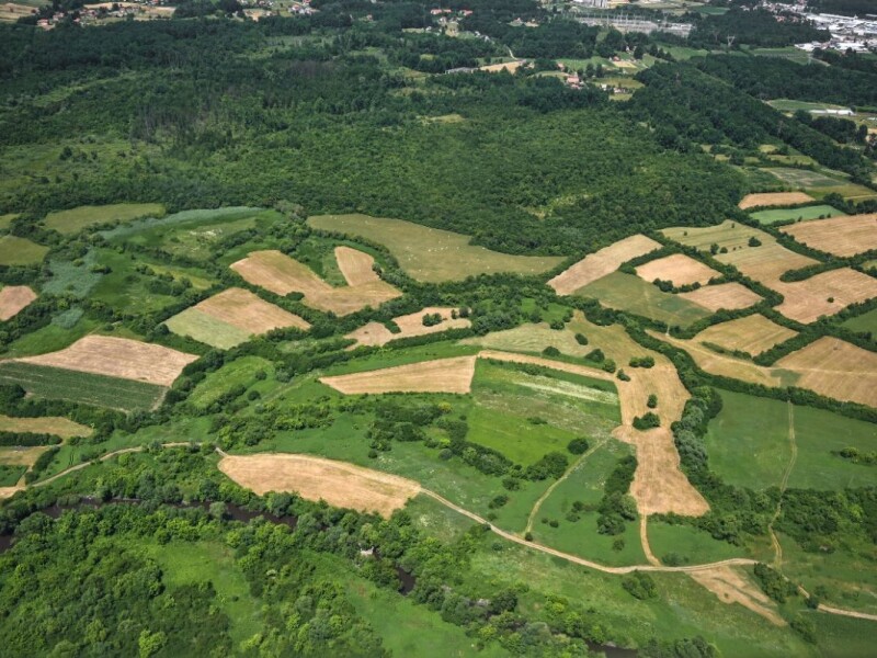 Zračni snimak tradicionalnog krajolika u blizini Živinica, gdje se rijeka, livade, šume i polja prirodno isprepliću. Ova fotografija prikazuje kako ruralna priroda još uvijek živi u ravnoteži – tiha, plodna i raznovrsna. Svaki komad zemlje nosi svoju boju, svoju svrhu i svoju priču.