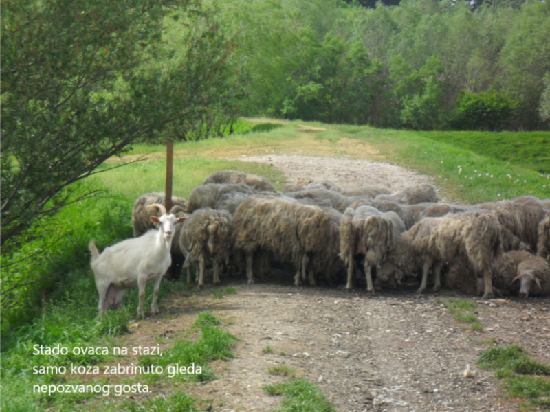 Stado ovaca na stazi, samo koza zabrinuto gleda nepozvanog gosta. #RuralFoto #životinje