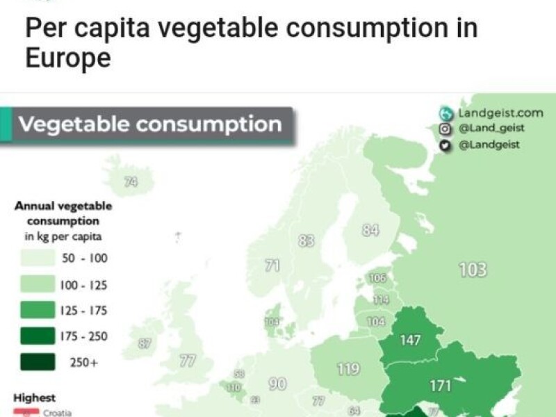 302 kg povrća po glavi stanovnika! #samojako Izvor: https://www.reddit.com/r/MapPorn/comments/q8nmwb/per_capita_vegetable_consumption_in_europe/