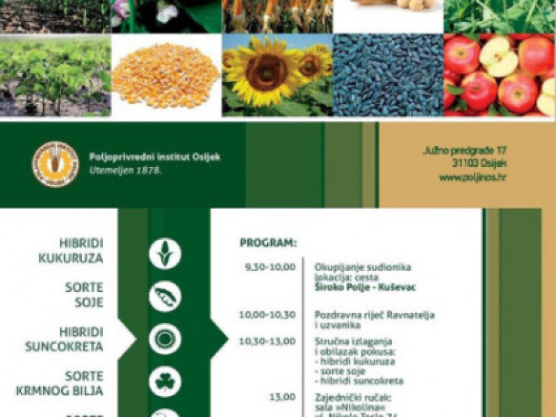 Poljoprivredni institut Osijek vas poziva na Dan polja kukuruza, soje, suncokreta i krmnog bilja. 07.rujna, 2016. u 09:30 počinjemo s okupljenjem sudionika na cesti Široko polje - Kuševac. Pridružite nam se!