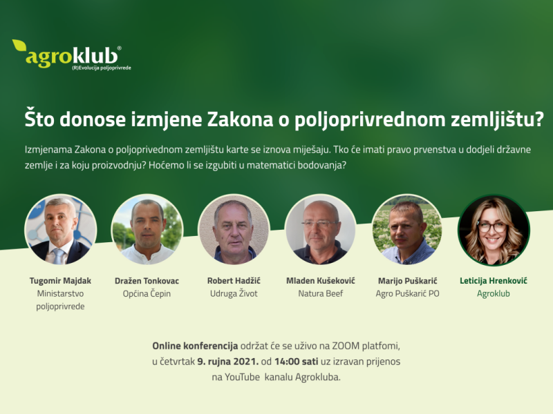 Želite li doznati što donose izmjene Zakona o poljoprivrednom zemljištu, prijavite se besplatno za sudjelovanje na online konferenciji Agrokluba koja će se održati 9. rujna u 14 sati na platformi Zoom.