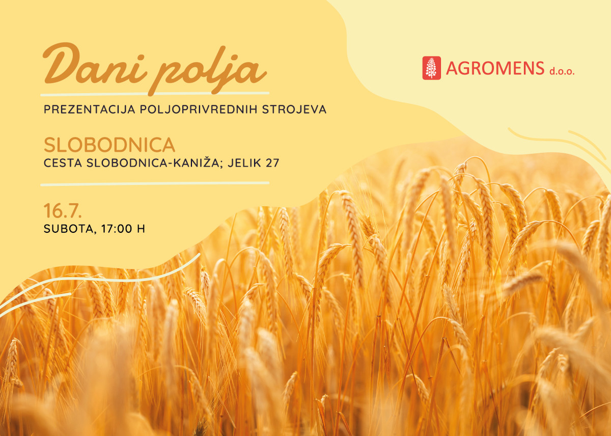 U subotu, 16.07.2022. od 17h pozivamo vas da dođete na naš Dan polja u Slobodnicu, Jelik 27 (Cesta Slobodnica-Kaniža). Iskoristite priliku i dođite vidjeti demo strojeva iz naše ponude te saznajte sve što vas o njima zanima.
