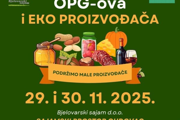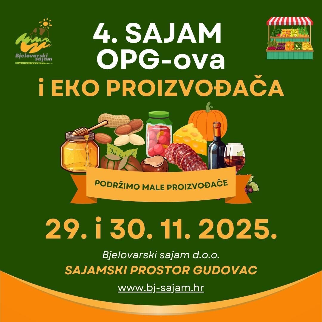 Pozivamo vas da posjetite sajamske manifestacije koje će se održati u subotu i nedjelju, 29. i 30. studenog 2025. godine na Sajamskom prostoru Gudovac. 4. Sajam OPG-ova i...