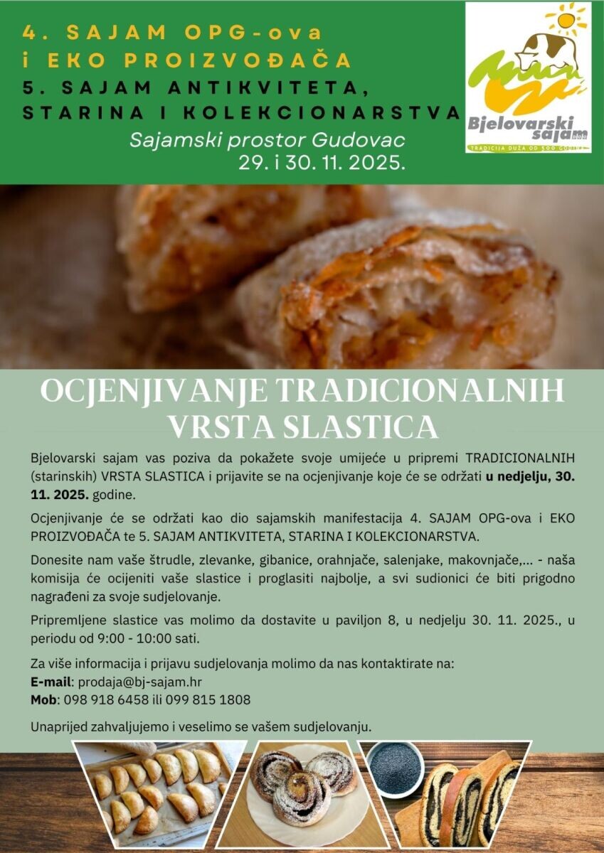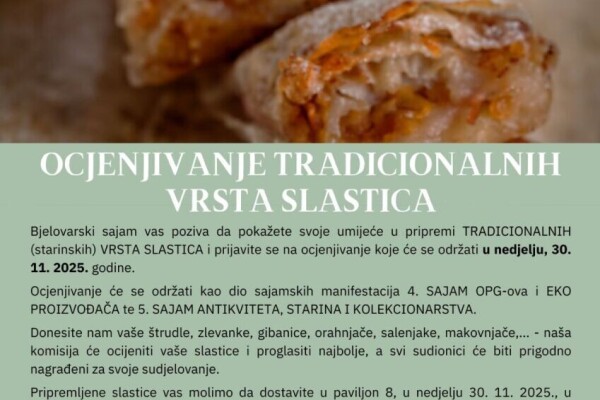 Pozivamo sve zainteresirane na OCJENJIVANJE TRADICIONALNIH VRSTA SLASTICA, koje će se održati ovu nedjelju (30. 11. 2025.) na Bjelovarskom sajmu u sklopu nadolazećih blagdanskih manifestacija. Donesite nam vaše štrudle. zlevanke, gibanice,... Više [+]