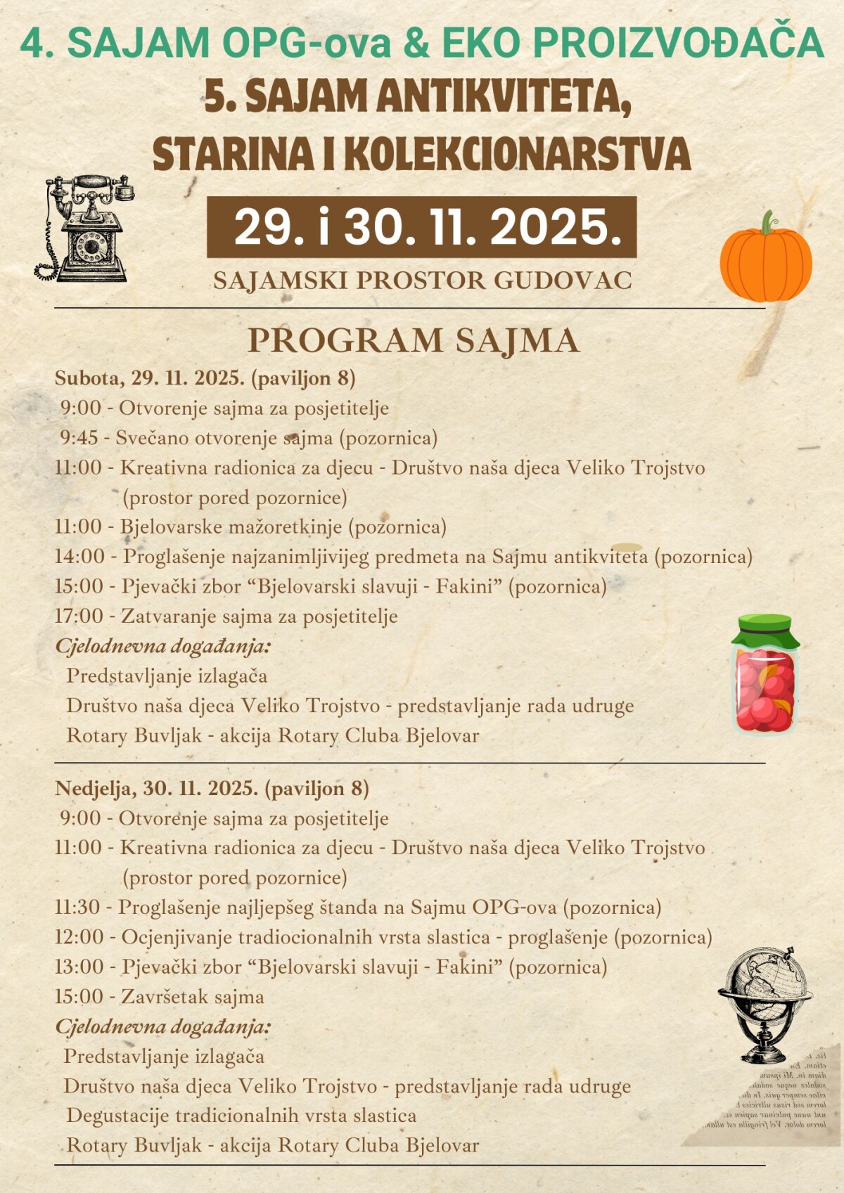 Pozivamo vas da posjetite sajamske manifestacije koje će se održati u subotu i nedjelju, 29. i 30. studenog 2025. godine na Sajamskom prostoru Gudovac.