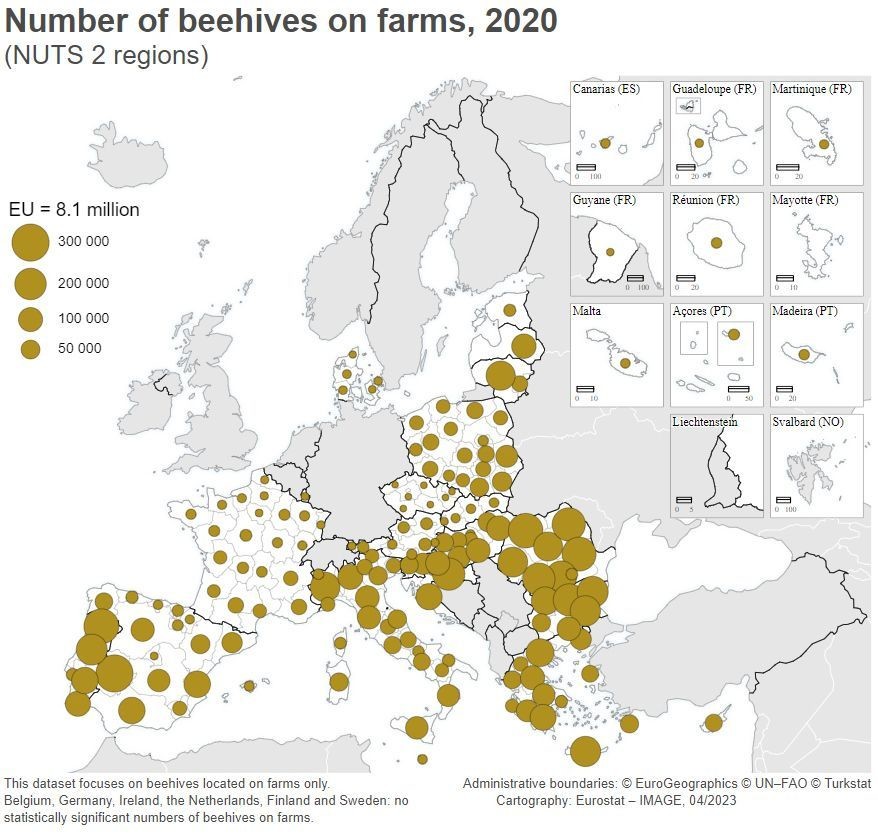 U 2020. je zabilježeno 8,1 milijun košnica. U Eurostatu ističu da je ovo samo dio ukupnog broja, jer popis poljoprivrede bilježi samo košnice na farmama