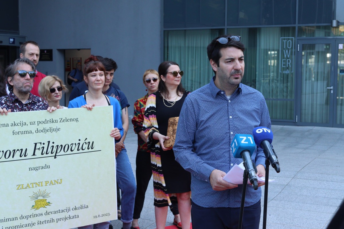 Aktivisti i aktivistkinje Zelene akcije, uz podršku mreže Zeleni forum, danas su ispred zgrade Ministarstva gospodarstva i održivog razvoja izveli performans kojim su uručili Zlatni panj Filipoviću i ukazali na evidentno sustavno zanemarivanje okolišnog sektora. Zbog toga smatraju da je potrebna reforma Ministarstva.