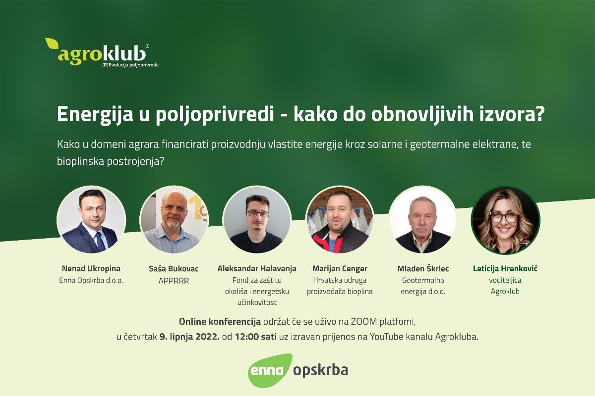 Kako iskoristiti obnovljive izvore energije u poljoprivredi i financirati proizvodnju vlastite kroz solarne i geotermalne elektrane, te bioplinska postrojenja saznat ćemo, između ostalog, na online konferenciji "Energija u poljoprivredi – kako do obnovljivih izvora?“ koja će se održati u četvrtak, 9. lipnja 2022. od 12 sati na Zoom platformi.