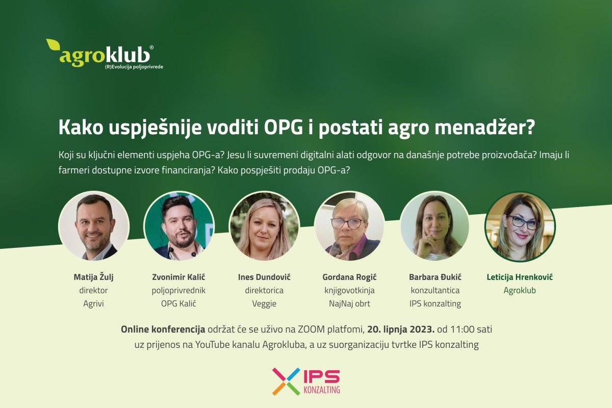 Što sve treba znati poljoprivrednik ili onaj tko to želi postati, tema je online konferencije "Kako uspješnije voditi OPG i postati agro menadžer?" koja će se održati 20. lipnja 2023. godine od 11 sati preko platforme ZOOM i uživo na YouTubu Agrokluba.