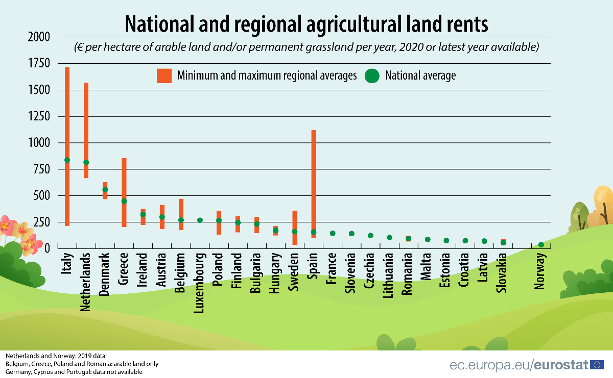 Prema podacima Eurostata, u 2020. godini je zakup jednog hektara obradivog zemljišta i/ili trajnog travnjaka bilo najskuplje u Italiji. U prosjeku je iznosio 837 eura po hektaru.