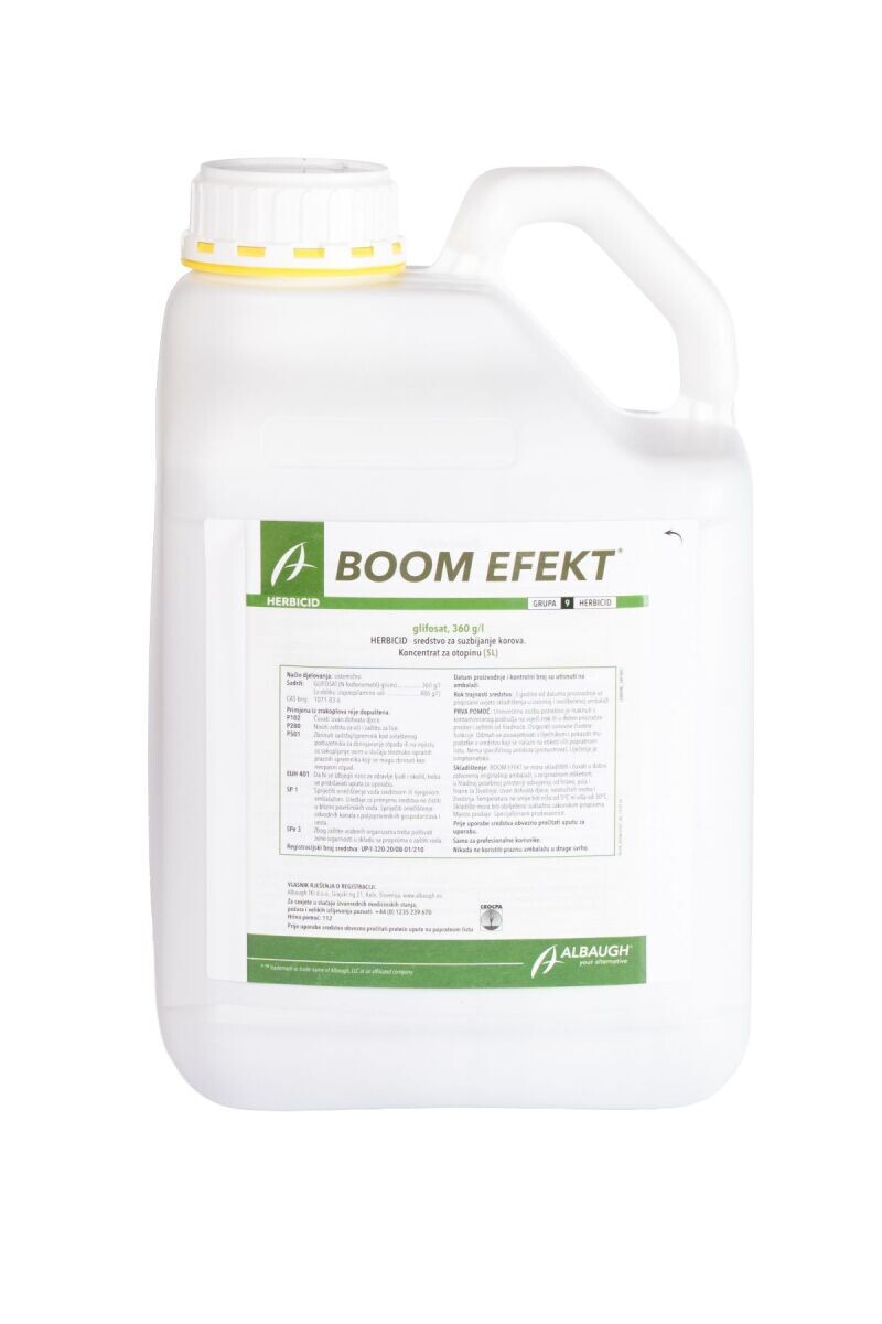 BOOM EFEKT 5L je sistemični neselektivni herbicid koji sadrži 360 g/l glifosata. Djeluje na širok spektar korova, uključujući jednogodišnje i višegodišnje uskolisne i širokolisne korove, kao i drvenaste korove s dubokim korijenom.