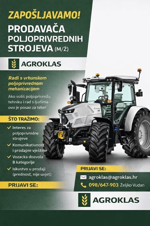 ZAPOŠLJAVAMO PRODAVAČA POLJOPRIVREDNIH STROJEVA (m/ž)