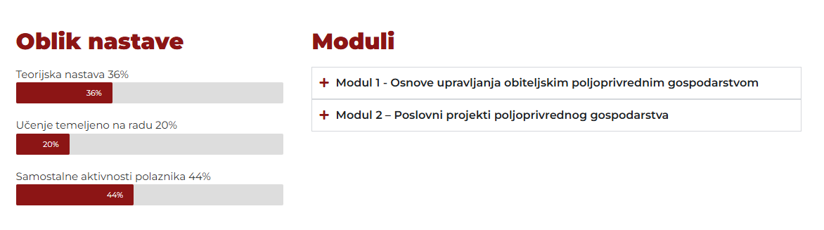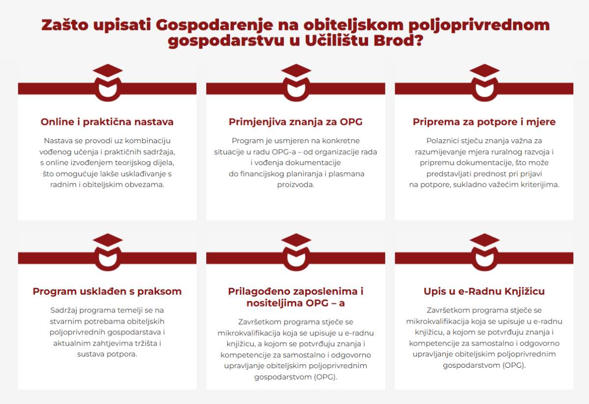 Program obrazovanja za stjecanje mikrokvalifikacije Gospodarenje na obiteljskom poljoprivrednom gospodarstvu osmišljen je kako bi polaznicima pružio praktična znanja i vještine potrebne za učinkovito vođenje OPG-a. Kroz program se stječu kompetencije iz organizacije i planiranja rada, financijskog praćenja i vođenja osnovne dokumentacije, poduzetničkog planiranja, korištenja mjera ruralnog razvoja te razumijevanja tržišta poljoprivrednih proizvoda, s ciljem stabilnog i održivog poslovanja gospodarstva.