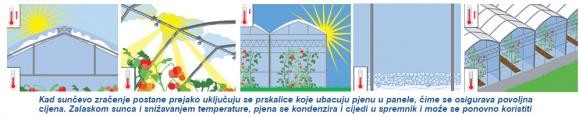 U razdoblju visokih razina sunčevog zračenja, potrebno je osigurati zaštitu biljkama putem odgovarajućih načina zasjenjivanja. Cilj je proizvodnje u zaštićenim prostorima pružiti biljkama optimalne uvjete za rast i postizanje povoljnog omjera svjetla i sjene. Aktivna pjena filtrira sunčevo svjetlo i istovremeno smanjuje količinu zračenja i time kontrolira temperaturu, a biljke dobivaju potrebnu energiju iz spektra sunčevog svjetla za proces fotosinteze. Okviri za zasjenjivanje u zaštićenom prostoru napravljeni su iz dva sloja polietilenskog filma između kojih se utiskuje aktivna pjena pomoću posebnih prskalica. Što se više pjene nalazi između ta dva sloja, veća je sjena. U sumrak, zalaskom sunca i smanjenjem temperature, pjena se kondenzira i u obliku tekućine noću se cijedi s krova i bočnih panela u spremnik, gdje je pohranjena do ponovnog korištenja po potrebi i idući dan.