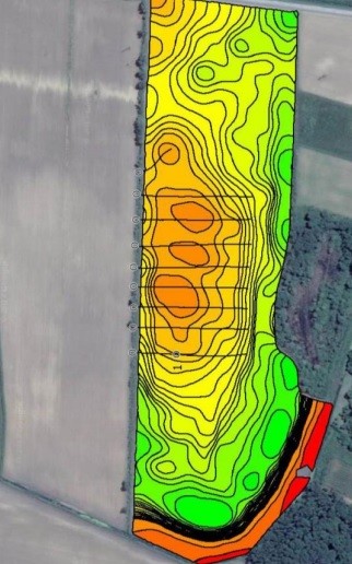 Drugo polje, istog vlasnika, veličine 16 ha, također je drenirano. Nakon snimanja preciznom GPS antenom dobivena je visinska karta polja koja je pokazala najugroženije zone u polju. Na slici 3. pored visinske karte polja vidljive su i lokacije na koja su kasnije postavljene drenažne cijevi.