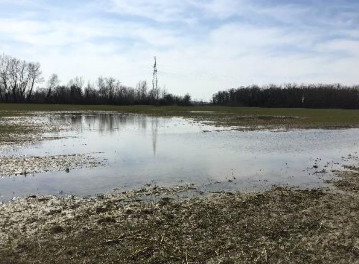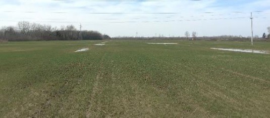 Nakon dreniranja obavljenog u jesen donosimo sliku napravljenu krajem ožujka 2017. godine. U gornjem desnom dijelu polja nisu prošle godine postavljene cijevi za dreniranje pa je vidljiva zona gdje se voda još zadržava. Kompletan centralni dio je isušen, a voda je drenažnim cijevima odvedena u kanal s lijeve strane.
