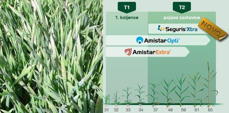 Prvo prskanje pšenice protiv bolesti najbolje je obaviti u fazi 1. do 2. koljence (početak vlatanja, kada je pšenica visine 20-25 cm). Za prvo prskanje pšenice, kao vrhunsku zaštitu tvrtka Syngenta preporuča Amistar Opti u dozi 2,5 l/ha koji će svojim djelovanjem suzbiti sve sojeve smeđe pjegavosti i ima pozitivan utjecaj na usjeve pogođene stresom.