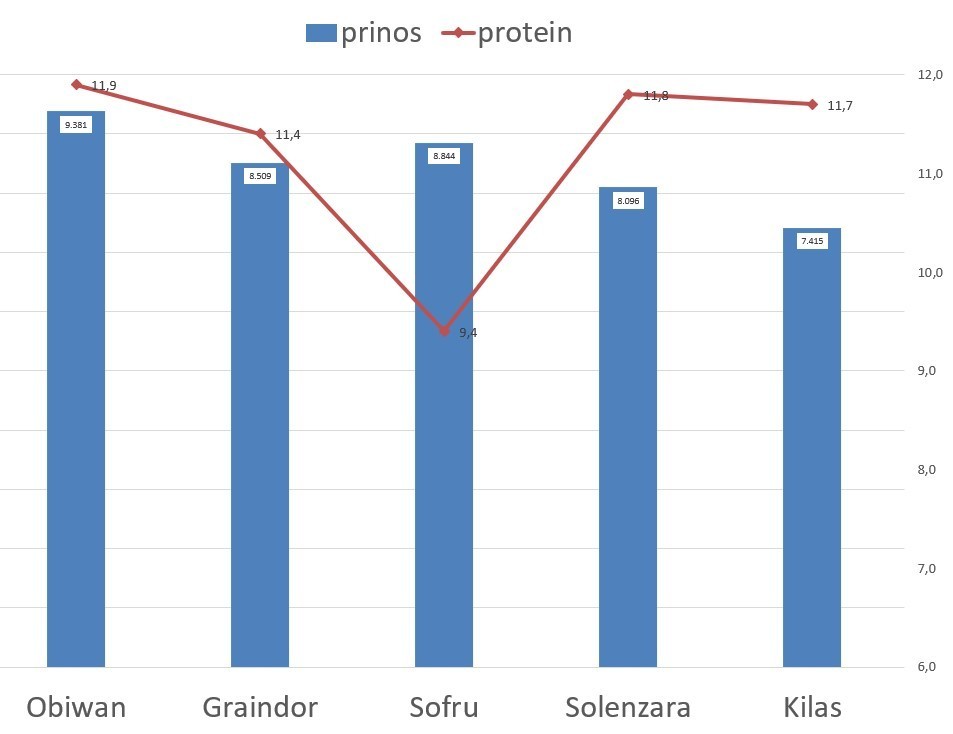 Najveći sadržaj proteina od 11,9 posto imala je također Obiwan. Nakon nje s 11,8 posto slijedi Solenzara. Riječ je o sorti najnovije generacije, a ona je visokoprinosna krušna pšenica, brkulja, koja je izuzetno prilagodljiva za sva uzgojna područja. Po vegetaciji je srednje rana, klasa otprilike u isto vrijeme kao i Sofru. Pripada u kvalitetnu grupu B2, a visina biljke je oko 4 cm viša od Sofru.