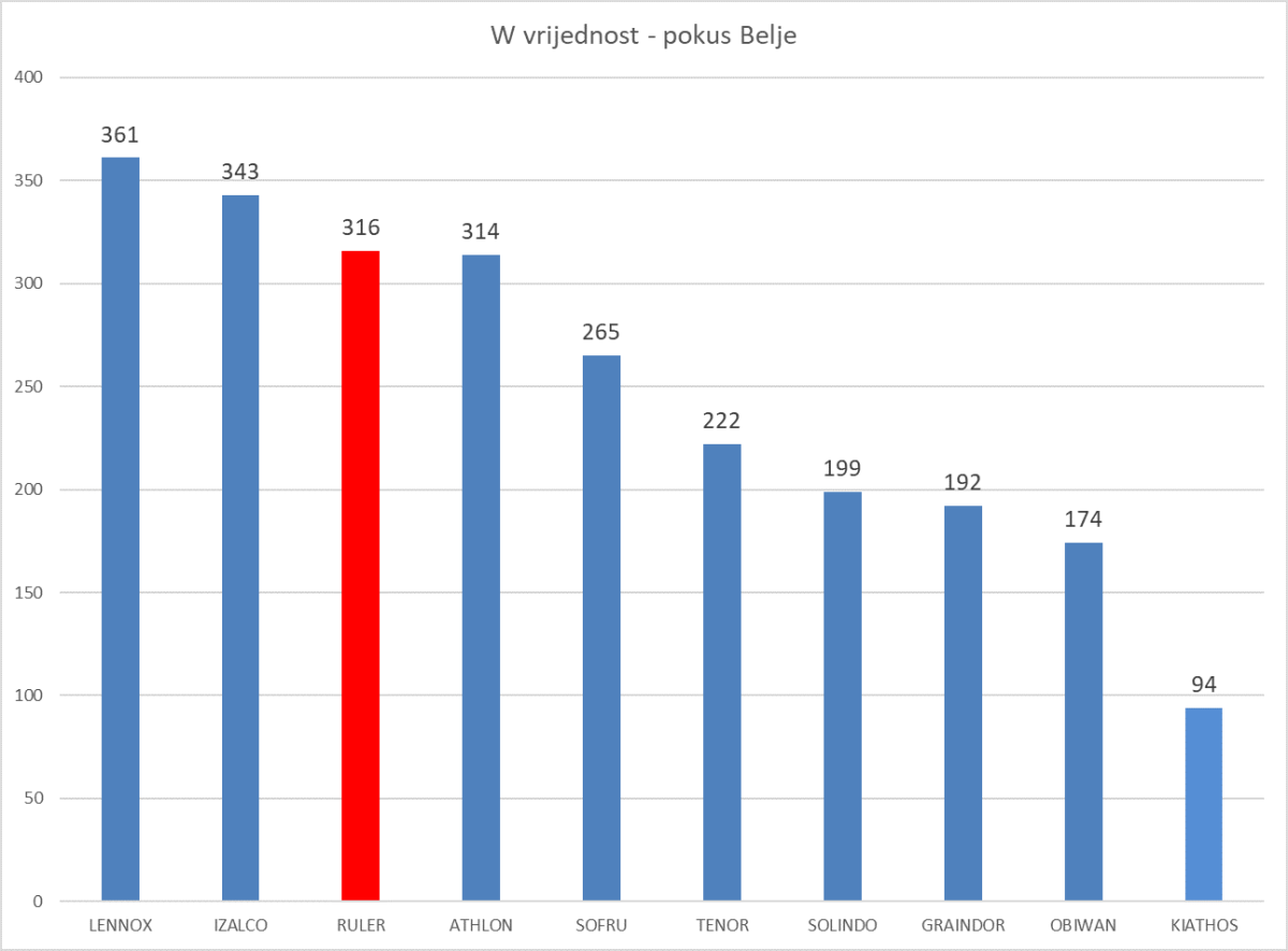 U pokusu tvrtke Belje plus d.o.o. bile su zastupljene sve RWA sorte te je napravljena reološka analiza. Ruler je imao odličnu W-vrijednost, čak 316, što je vrlo blizu poboljšivačima brašna - sortama Izalco i Lennox.