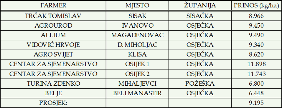 U ovogodišnjim pokusima na devet lokacija postigla je prosječne prinose od 9.195 kg/ha. Najveći prinos postignut je na polju HAPIH-ovog Centra za sjemenarstvo od 11.898 kg/ha.