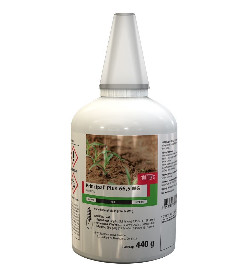 Principal Plus 66,5 WG je jedinstvena formulacija herbicidnog pripravka koji sadrže čak tri aktivne tvari u jednoj granuli (nikosulfuron, rimsulfuron i dikambu), zbog čega pruža učinkovito rješenje u suzbijanju svih najznačajnijih jednogodišnjih i višegodišnjih uskolisnih i širokolisnih korova u kukuruzu za zrno i silažu.