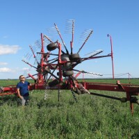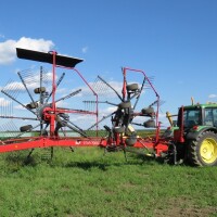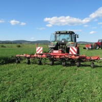 "Evo, danas ste vidjeli: naši dečki će za jednu smjenu pokositi 80 hektara lucerne. Odmah iza kosilice ide SIP-ov razbacivač, također zahvata devet metara, koji omogućuje brže prosušivanje pokošene mase i već sutradan možemo balirati lucernu s vlagom od 12 do 15 posto", kaže naš domaćin. Dodaje da su nabavili cijeli set priključnih strojeva ove tvrtke za košenje, sušenje i baliranje lucerne. Uz kosilicu i razbacivač imaju i 2 skupljača zahvata po sedam metara.