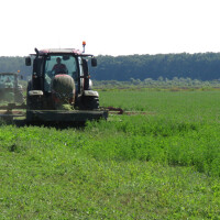 Odvezao nas je ponosni vlasnik i na lucernište da vidimo kako ide posao. Njegovi djelatnici Dražen Mesaroš i Hrvoje Dikanović rutinski su obavljali košnju s priključcima slovenske tvrtke SIP Šempeter koje vuku jači traktori od 160 konjskih snaga, iako su za ove poslove košnje, kažu, dovoljni i oni od 130 ks.