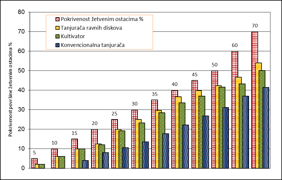 Zaštita i očuvanje vlage tla sa što manjim gubitcima te ublažavanje toplinskog stresa omogućeni su usitnjenim žetvenim ostacima, odnosno pokrivanjem površine tla s najmanje 30 % ili još bolje s 35 - 45 % te poravnavanjem i sabijanjem površine valjcima kao što možete vidjeti dolje u grafikonu.