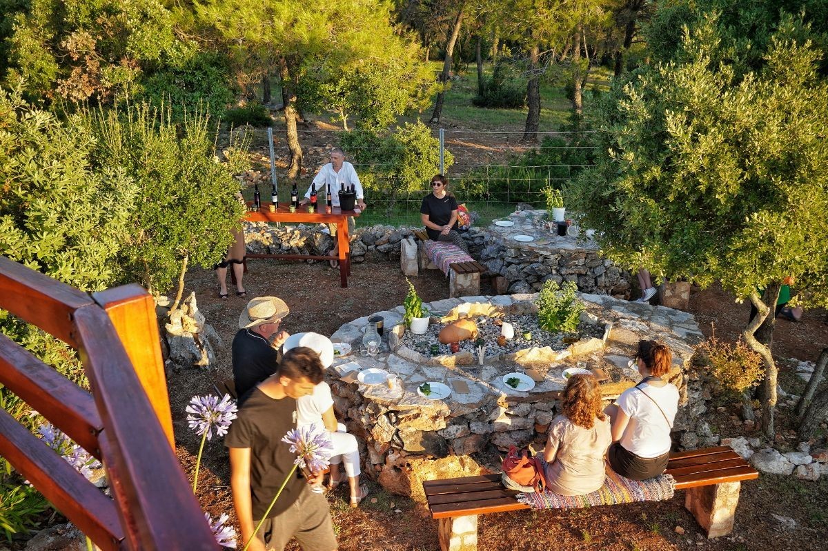 Na kamenim stolovima posluženi su najprije Moja M 2020 (maraština) i pogačicama s ružmarinom uz malo maslinova ulja Fjori Fora. Slijedio je Laganini 2020 (crna drnekuša) i sir s komoračem i bosiljkom. Plavac mali pod imenom Prije 6009 godina iz 2018, nastaje od grožđa na području Vrisnika, s bijeloga pijeska. Odležan u francuskom i američkom hrastu razvija zanimljive okuse, a nazivom podsjeća na otočnupovijest, kada je prije 6.009 godina u Grapčevoj špilji naslikana lađa što je jedno od najozbiljnijih svjedočanstava najranije dalmatinske i mediteranske civilizacije. Pratio ga je kozji sir s origanom, lokalnog gdinjskog OPG-a Dijane Ježić.
