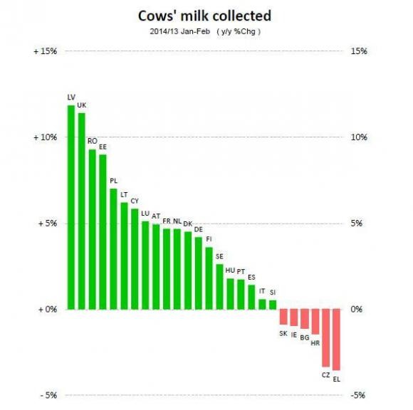 Statistički podaci Eurostata o europskom mlijeku, kretanju cijena i proizvodnji u pojedinim europskim zemljama ukazuju na nova porazna saznanja. Naime, u grafikonu ispod možete vidjeti kako je količina prikupljenog mlijeka u siječnju i veljači 2014. naspram istog razdoblja prošle godine, u Hrvatskoj, kao i u Bugarskoj, Slovačkoj, Irskoj, Češkoj i Grčkoj opala za manje od pet posto.