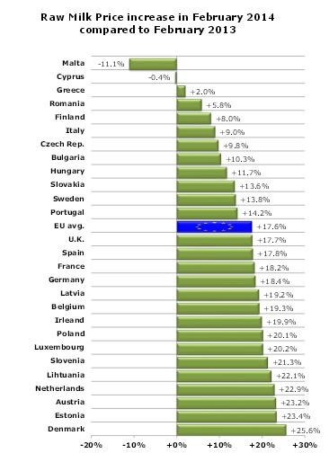Cijena sirovog mlijeka s obzirom na veljaču prošle godine pokazala je na prosječnoj razini EU porast od 17,6 posto. Od svih država Europske unije, hrvatska poljoprivredna proizvodnja zabilježila je najveći pad u prošloj godini, a sektor mljekarstva, vidljivo iz navedenih podataka, izrazito je pogođen. Budući da domaće potrebe za mlijekom iznose 900 milijuna litara godišnje, očito je da se polovina potreba namiruje iz uvoza. Iako procjene stručnjaka govore da bi Hrvatska mogla prehranjivati 25 milijuna ljudi, uvoz mlijeka u 2013. povećan je za dva puta u odnosu na 2012. godinu.