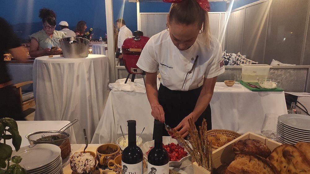 Te nam je večeri pripravila carpaccio od bijele ribe i hobotnice, male zalogaje sa skutom i jagodama te šljive punjene mladim sirom i omotane pancetom koje su dovršene na grillu te grisine, pogaču s usoljenom limunom i ružmarinom i kruh s različitim brašnima i divljim kvascima.