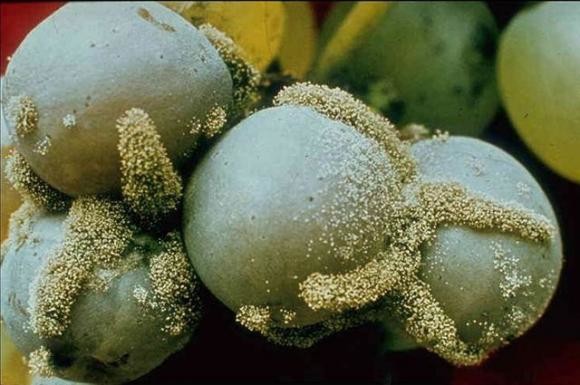 Siva plijesan (Botritis), siva plijesan redovita je pojava u kišovitim godinama, grožđe počne naglo trunuti pred berbu. Trule grozdove pokriva siva plijesan poput paučine, a dosta tako trulih boba otpadne. Razlog ovoj pojavi je infekcija grozdića patogenom gljivicom po imenu siva plijesan (Botritis cinerea)-uzročnik truleži ili botritisa. Infekcija se može dogoditi u svim fazama razvoja vinove loze (od cvatnje do berbe), ali su najkritičnije faze završetak cvatnje, zatvaranje grozda, početak zriobe i pred berbu. Najopasniji je njezin napad u stadiju dozrijevanja grožđa. Na zaraženim bobicama pojavljuju se najprije smeđe pjege koje se povećavaju i zahvaćaju cijelu površinu bobice. Ukoliko je vrijeme suho, tada se takve bobice smežuraju i suše. Do zaraze dolazi ako nakon duljeg sušnog perioda, padnu jače kiše jer čokot naglo povlači vodu pa unutar bobica dolazi do jakog tlaka, uslijed čega dolazi do pucanja pokožice. Siva plijesan se javlja u svim vinogradima gdje može pod povoljnim uvjetima ne samo smanjili berbu u visokom postotku, već i utjecati na kvalitetu mošta odnosno vina. U pojedinim klimatskim predjelima (zap. Europa), Botrytis cinerea dolazi pod imenom "plemenita plijesan" pošto svojim napadom poboljšava kvalitetu berbe izazivajući tzv. "plemenitu trulež" grožđa. Međutim u našim klimatskim prilikama, naročito u području plantažnih vinograda istočne Slavonije i Srijema, predstavlja glavni problem uzgoja vinove loze, odnosno primarni faktor koji smanjuje kvalitetu i kvantitetu berbe.