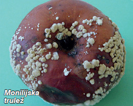 Od češćih bolesti plodova jabuke i kruške u skladištu javlja se i monilijska trulež, čiji je uzročnik gljivica Monilinia fructigena.  Bolest se još naziva i smeđa trulež. Riječ je o istoj gljivici koja dolazi na plodovima jabuke i za vrijeme vegetacije. Za razliku od gorke truleži, ova se trulež javlja već na samom  početku skladištenja. Vrlo brzo se širi pa dolazi do naglog propadanja plodova. U skladištima se može javiti na dva načina. U prisutnosti svjetla javlja se tzv. tipični tip monilijske truleži, koja se očituje karakterističnim nakupinama konidija ili tzv. jastučićima, koji dolaze u koncentričnim krugovima na površini zaraženih plodova ili se u odsutnosti svjetla javlja tzv. sterilni tip monilijske truleži, kada plod pocrni i truli bez stvaranja karakterističnih nakupina konidija ili jastučića na površini ploda. Mjere zaštite su suzbijanje same bolesti za vrijeme vegetacije uobičajenim fungicidima protiv monilijske truleži plodova.