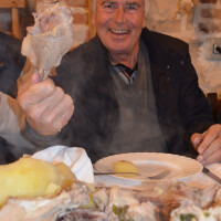Najprije juha "s očima" od tučevine s rižima, zatim lešo tučevina s povrćem i domaćim kiselim zeljem začinjenim s mladim maslinovim uljem. Vina crna i bila... Svaki od gostiju donio je ponešto, svoje ulje ili vino, a Nado Butić, predsjednik Udruge maslinara i uljara Maslina općine Poličnik, i ovaj put dvije tegle vlastitih tek konzerviranih zelenih maslina od sorti Ascolana tenera i još neke sorte kojoj sam zaboravio ime. "Dopale su se svima". To mu je, veli, gotovo jednako drago priznanje kao i medalje koje je za svoje masline ulje dobio više puta na maslinarskim smotrama, najviše na međunarodnoj manifestaciju uljara i maslinara Maslina u Splitu.