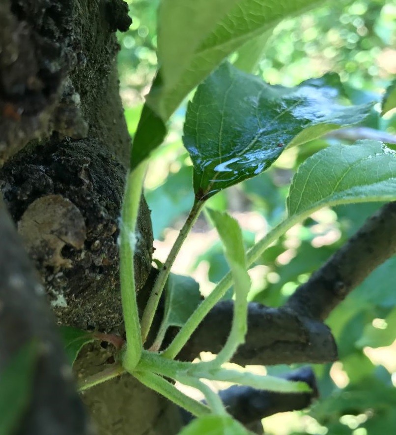 Štetnik je počeo migrirati s mjesta prezimljenja (korjenovog vrata, rak rana na granama, mjestima reza, pukotina kore na deblu) na gornje dijelove krošnje. Prvo se naseljava na jednogodišnjim izbojcima stvarajući kolonije uši (beskrilne ženke ležu ličinke) koje su prekrivene bijelom voštanom prevlakom u pazušcima pupova i ovogodišnjim mjestima reza.